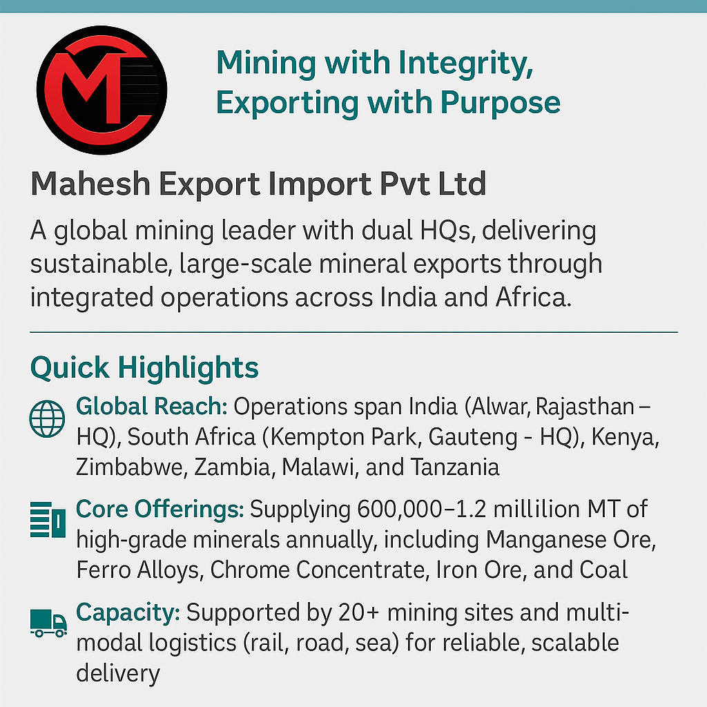 Mahesh Export Import Pvt Ltd stands as a global leader in the mining and mineral trade, with dual headquarters in Rajasthan, India, and Gauteng, South Africa. We are a vertically integrated enterprise focused on mineral exploration, extraction, processing, and export, bridging resource-rich regions with industrial economies. Our commitment lies in sustainable mining and efficient logistics, supporting steel manufacturing, energy production, and infrastructure development across India and Sub-Saharan Africa.